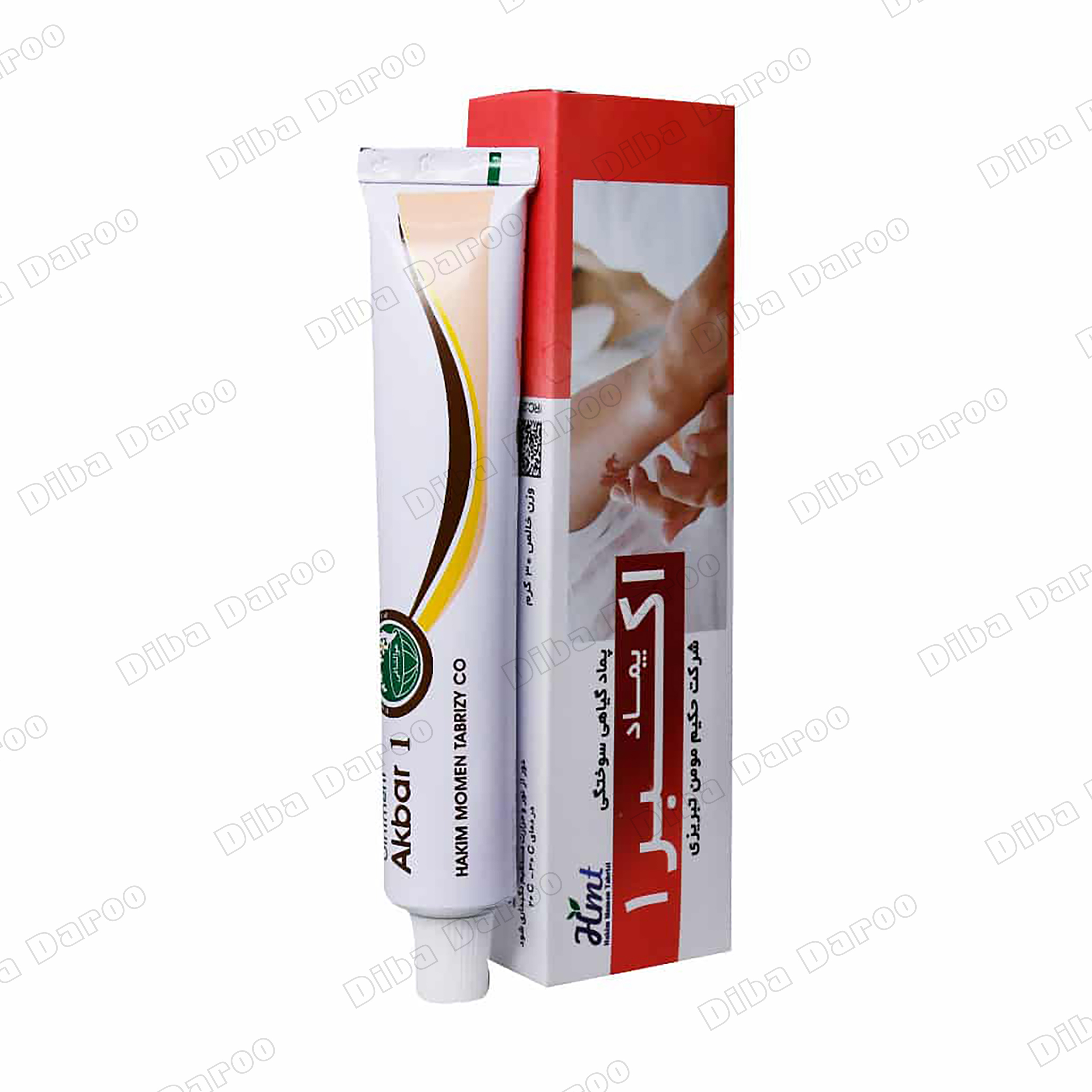 پماد اکبر 1 ترمیم کننده سوختگی دارای مواد ضد عفونیکننده و فاقد مواد آلرژی زا است. این پماد در بهبود عوارضی مانند کفگیرک، دمل، فیستول و دردهای بواسیری نیز بسیار موثر است. این محصول از واحد تولیدی حکیم مومن تبریزی است که حاوی درخت هواچوبه، روغن کرچک، اسانس نعناع و آویشن تشکیل شده است. با استعمال پماد در سوختگیها، بافتهای زیرین پوست به طور طبیعی و بدون هیچ گونه تغییراتی به رشد سریع و سالم خود ادامه میدهند و عمل ترمیم پوستی را تسریع میکند. بعلت داشتن مواد موثر گیاهی جریان خون را تسریع و تسهیل مینماید، و در خون مردگیهای پوستی، واریس و قانقاریا بسیار موثر خواهد بود. روش های درمان زخم های سوختگی زیاد است که یکی از آنها استفاده از پماد اکبر است.